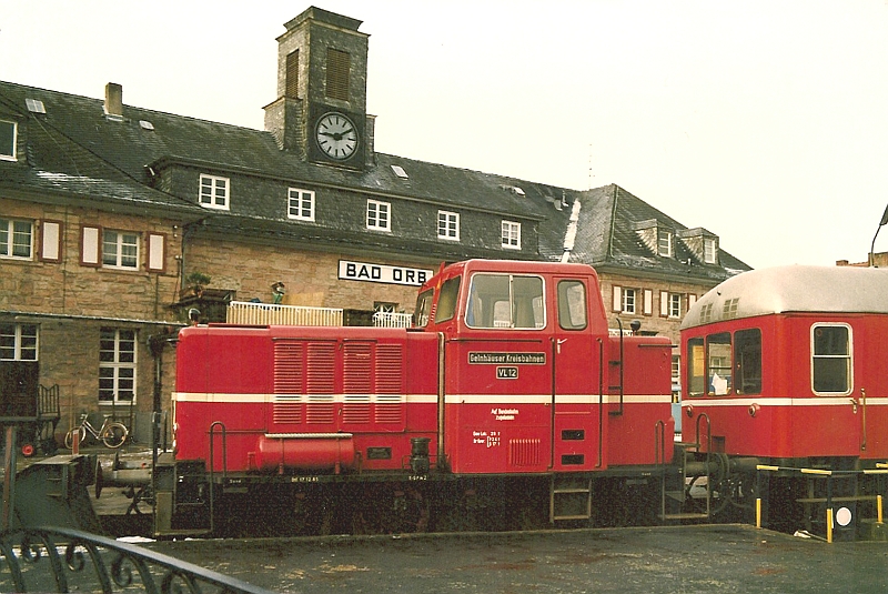 Diesellokomotive VL 12 der Gelnhäuser Kreisbahnen vor dem imposanten Bahnhofsgebäude der Kurstadt Bad Orb.