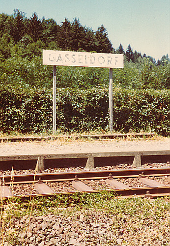 Das alte Bahnhofsschild aus Bundesbahnzeiten am 22.07.1983 in ziemlich ausgeblichenem Zustand.