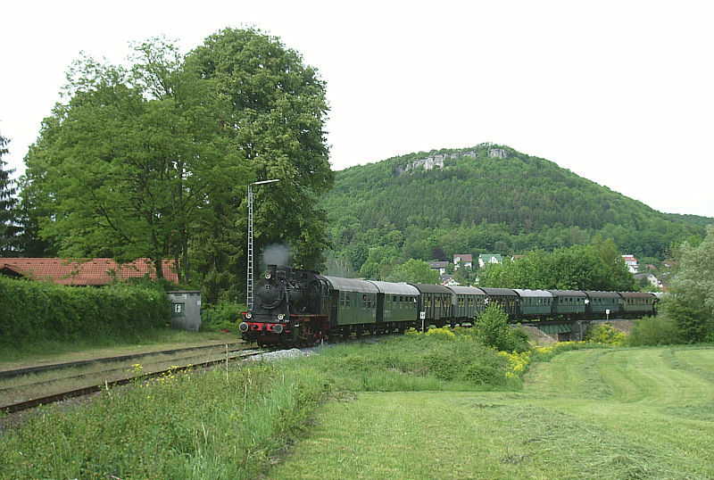 Zehn Personenwagen hatte Zug 22 von Behringersmühle nach Ebermannstadt am 13.05.2007. Lok 4 der Dampfbahn Fränkische Schweiz musste den Zug bei der Einfahrt nach Gasseldorf abbremsen, weil an dem nur als Bedarfshalt ausgewiesenen Haltepunkt Ausflügler den Zug verlassen wollten. Aufnahme: Axel Tomforde, Hamburg