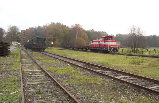 Am 01.11.2002 holte V 2.017 der AKN dreizehn Waggons aus dem Industriegebiet. Zusammen mit den links stehenden acht Waggons aus dem Bundeswehr-Depot kam also eine hübsche Fuhre nach Hamburg-Tiefstack zusammen. Auf dem Hinweg allerdings hatte die Lok keine Wagen mitgebracht.