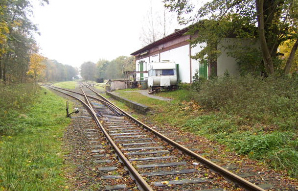 Dies Bild zeigt die Ansicht des Bahnhofs Glinde von der Einfahrt aus Richtung Trittau her. Der kurze Bahnsteig ist ausreichend für einen Triebwagen, die weitläufigen Anlagen dahinter zeugen von der einstigen Bedeutung des Bahnhofs. Aufnahme vom 30.10.2002