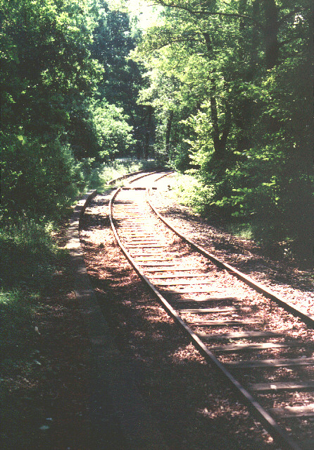 Züge, die von Hamburg kommend direkt in das Werk fuhren oder in Gegenrichtung von dort kamen, konnten im Bf. Glinde nicht den eigentlichen Personenbahnsteig benutzen, weil der Abzweig bereits davor lag. Daher wurde ein weiterer Bahnsteig in unmittelbarer Nähe zum Bahnhof noch in der Kurve im Waldstück angelegt, damit auch hier Reisende ein- und aussteigen konnten. Diese Aufnahme vom 18.06.2000 zeigt links den Bahnsteig. Das Gleis führt weiter zum Werksgelände im "Glinder Horst". |