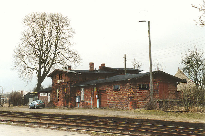 Das für Landschaft und Strecke typische niedrige Backstein-Empfangsgebäude des Bahnhofs Groß Wüstenfelde hatte offenbar schon so manche Ausbesserung im Mauerwerk erfahren. Am 13.04.1996 hatte es aber nur noch eineinhalb Dienst-Monate vor sich.