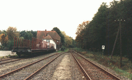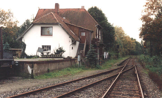 Das Empfangsgebäude des Bahnhofs Hermannsburg befindet sich am südlichen Ende des Bahnhofsgeländes, wo gleich hinter dem Bahnsteig die Ausfahrt in Richtung Beckedorf liegt. 09.10.1993