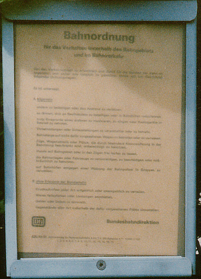 So spartanisch die Ausstattung des Haltepunkts auch anmuten mag - an einem ließ es die Bundesbahn nicht fehlen: Man hielt es offenbar für sinnvoll und notwendig, die Reisenden durch Aushang der Bahnordnung auf das richtige "Verhalten innerhalb des Bahngebiets und im Bahnverkehr" aufmerksam zu machen.