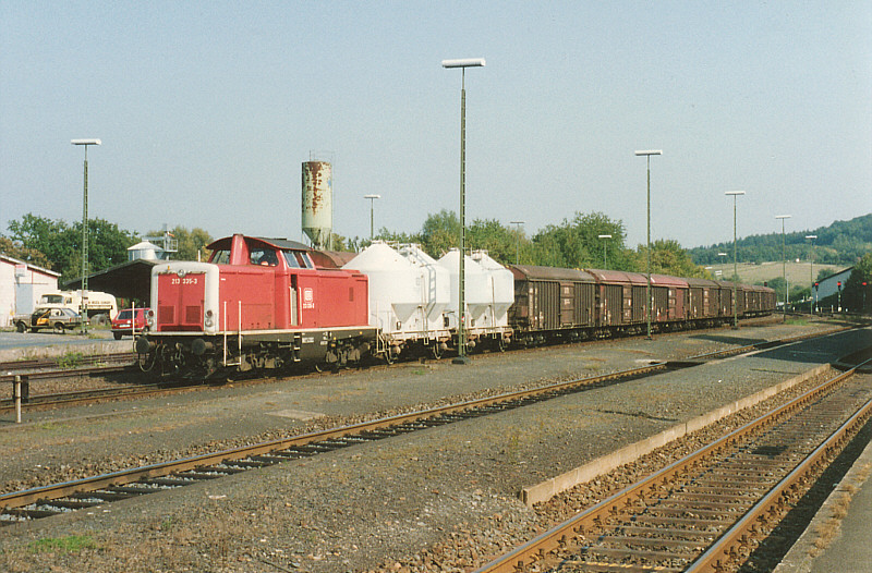 213 335 wartete am 28.09.1992 vor einem Güterzug in Richtung Siershahn auf die Möglichkeit zur Abfahrt, die sich aber erst nach einer Kreuzung zweier Personenzüge hier im Bf. Montabaur ergeben sollte.