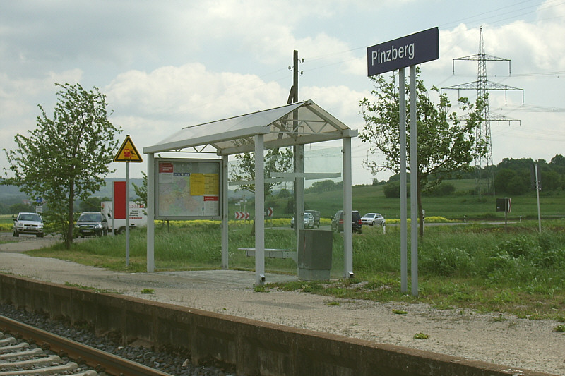 Der Haltepunkt Pinzberg, hier aufgenommen am 10.05.2007, liegt neben der Landstraße zwischen Feldern und Wiesen. Der Ort liegt auf der Höhe, deren Ausläufer rechts im Bild noch zu sehen ist, einen Kilometer abseits der Bahnstrecke.