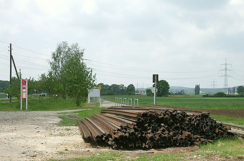 Die Überreste der nur wenige Wochen zuvor erfolgten Streckensanierung lagen in Form alter Schienen noch am 10.05.2007 im Bereich des Haltepunkts Pinzberg.