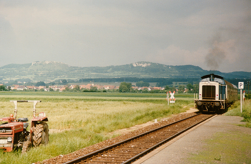Am 22.06.1987 fuhr 211 026 mit N 7769 von Ebermannstadt nach Forchheim. Die Felsen im Hintergrund (links das "Walberla") sind die ersten gebirgigen Vorboten, die dem Reisenden begegnen, der über Forchheim in die Fränkische Schweiz gelangt.