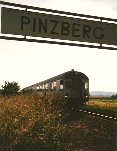 Am 22.06.1987 fuhr der Zug, befördert von 211 026, in den Haltepunkt Pinzberg ein. Rätselhaft bleibt, wie es zu dem nicht normgerechten "B" auf dem Stationsschild gekommen war. Aufnahme: Axel Tomforde, Hamburg |