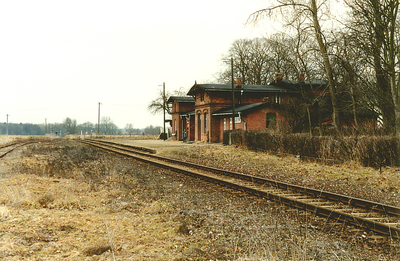 Das Gleisfeld vor dem Empfangsgebäude nahm breiten Raum ein. Der Bahnhof Poggelow war einst viergleisig in Betrieb genommen worden. Am 13.04.1996 war außer dem Streckengleis nur noch ein Ausweich- und Ladegleis vorhanden.