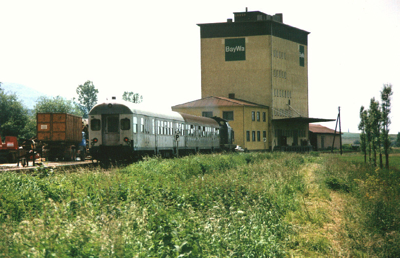 An dem großen BayWa-Lagerhaus am Bf. Pretzfeld musste auch N 7762 Ebermannstadt - Forchheim am 22.06.1987 vorbei. An der Spitze des Zuges befand sich 211 026. Die Größe des Lagerhauses mag für einen Marktflecken wie Pretzfeld zunächst überdimensioniert wirken. Im Sommer werden die Kapazitäten allerdings tatsächlich benötigt, da Pretzfeld und seine Umgebung das größte geschlossene Kirschenanbaugebiet Europas darstellen und die meist kleinbäuerlichen Betriebe innerhalb nur weniger Tage große Mengen an Kirschen hier anliefern. Aufnahme: Axel Tomforde, Hamburg