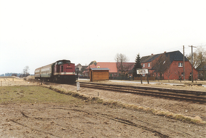 202 414 vor RB 14962 Teterow - Gnoien am 13.04.1996 bei der Einfahrt in den Haltepunkt Schwetzin