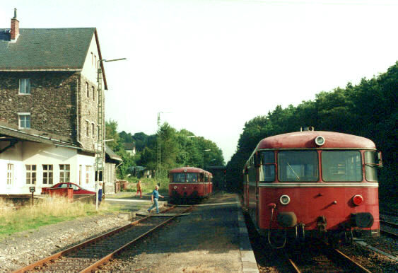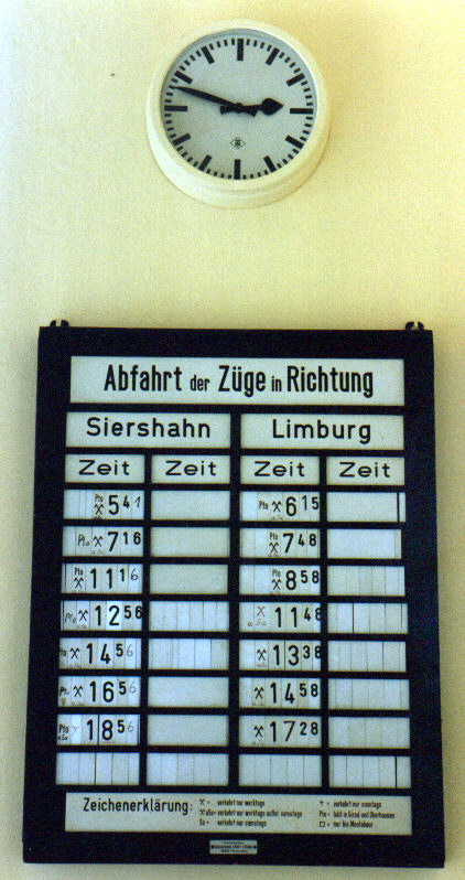 | Auch die einzige Personenzugkreuzung dieses Bahnhofs kurz vor 1500 Uhr geht aus der Tafel hervor: links 796 745 + 996 609 als N 6880 Limburg – Siershahn, rechts 796 769 + 996 779 (Schlussfahrzeug) als N 6879 Siershahn – Limburg 28.09.1992 |
