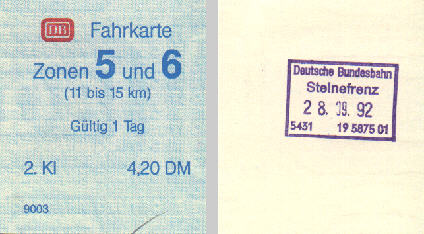 ![]() Fahrkarte von Steinefrenz, erworben am dortigen Schalter am 28.09.1992 |