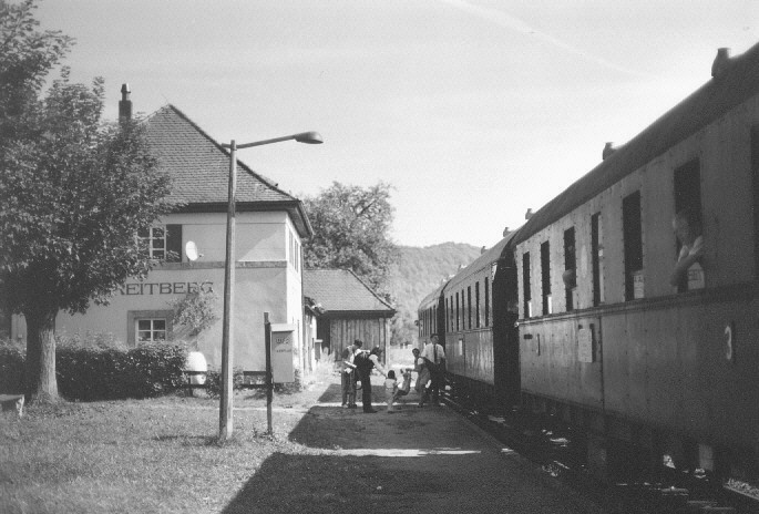 Wie in alten Zeiten: Ausflügler kommen mit der Bahn nach Streitberg. Am 08.09.2002 war es allerdings ein Zug der Dampfbahn Fränkische Schweiz, der planmäßig von Behringersmühle nach Ebermannstadt fuhr und einen Einblick in die Reisekultur vergangener Zeiten bot. Aufnahme: Axel Tomforde, Hamburg