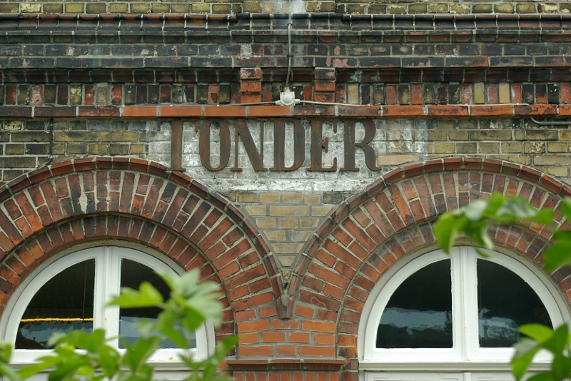 Die wechselvolle Geschichte Nordschleswigs zeigt sich auch in der Beschriftung des Bahnhofsgebäudes in Tønder: Zur Bauzeit in den 1880er Jahren stand Nordschleswig unter der Herrschaft der deutschen Krone. Die hier auf der Bahnsteigseite am Gebäude angebrachten Buchstaben bildeten also den Namen TONDERN. Nach der Volksabstimmung 1920 wurde Nordschleswig – dem Wunsch des Großteils der Bevölkerung entsprechend – dänisch. Die betroffenen Städte und Gemeinden erhielten offiziell ihre dänischen Bezeichnungen. Folgerichtig änderte man auch im Bahnhof der nunmehr als Tønder bezeichneten Stadt die Beschriftungen. Am Empfangsgebäude beschränkte man sich darauf, das N am Ende zu entfernen. Dass es dort war, konnte man auch 90 Jahre später noch deutlich erkennen. Ob man dem O seinerzeit einen Querstrich aufgesetzt hatte, war am 19.07.2010 allerdings nicht ersichtlich. Vorhanden war jedenfalls keiner. Aufnahme: Axel Tomforde, Hamburg