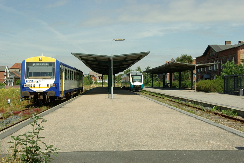 Die Züge von Niebüll haben in Tønder Anschluss an jene nach Esbjerg. Links startet am 19.07.2010 gerade VT 411 der NOB (Typ NE 81) als Zug Nr. 90009 in Richtung Grenze.