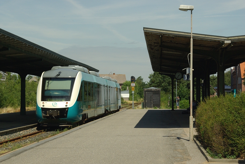 Der Anschlusszug von/nach Niebüll hat den Bahnhof Tønder bereits wieder verlassen.