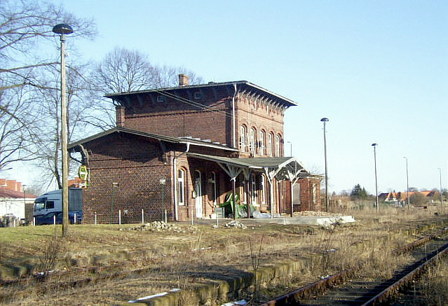Die Gleisseite des Empfangsgebäudes am 16.02.2003. Man schickte sich offenbar an, für die Gaststätte eine Terrasse zu errichten. Das hätte – ein tragfähiges Konzept vorausgesetzt sicherlich ein gemütlicher Biergarten werden können. Aufnahme: Axel Tomforde, Hamburg