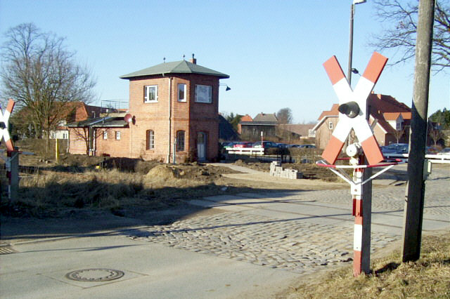 Bahnübergang Pampriner Straße mit ehemaligem Stellwerk Zo in der Ausfahrt Richtung Hagenow, aufgenommen am 16.02.2003.
