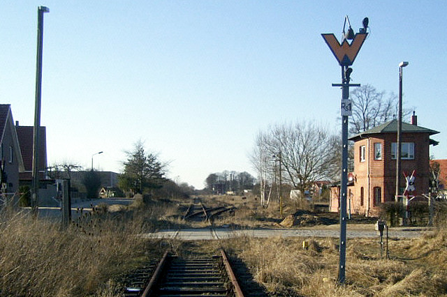 Blick in den Bahnhof aus Richtung Hagenow beim Bahnübergang Pampriner Straße, aufgenommen am 16.02.2003.