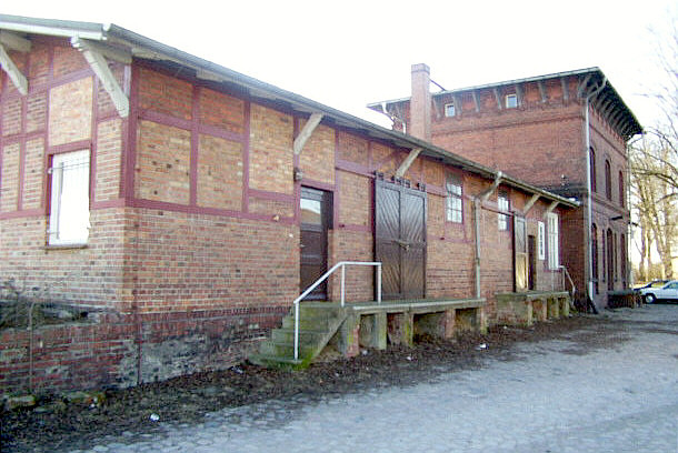Güterschuppen und Empfangsgebäude des Bahnhofs Zarrentin von der Straßenseite gesehen.Sie hatten am 16.02.2003 schon längst nicht mehr ihre alte Funktion, waren aber zumindest äußerlich und auf den ersten Blick noch recht gut erhalten.