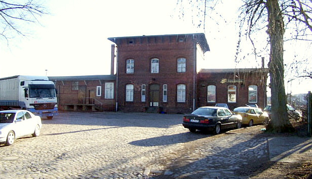 Blick über den Bahnhofsvorplatz auf Empfangsgebäude und Güterschuppen des Bahnhofs Zarrentin, aufgenommen am 16.02.2003.
