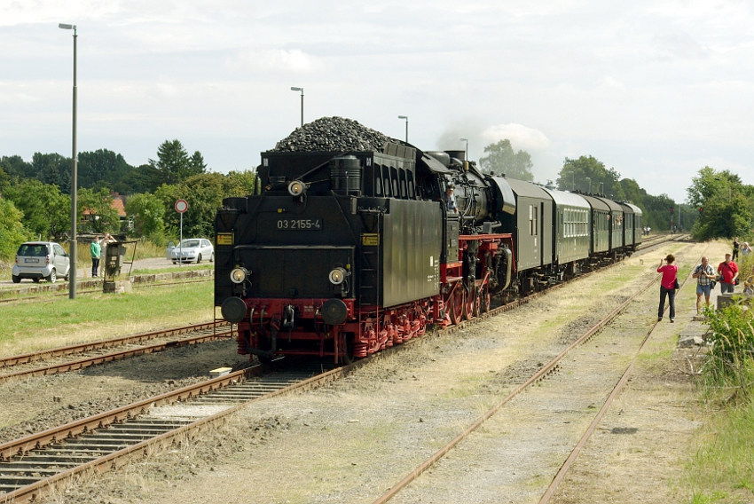 Am 17.08.2013 war die von der Wedler Franz Logistik GmbH & Co. KG (WFL) museal erhaltene 03 2155 zwischen Zarrentin und Hagenow Land bzw. Wittenburg mit Pendelzügen unterwegs. Neben zwei Wagen der WFL waren noch vier historische Nebenbahnwagen der Mecklenburgischen Eisenbahnfreunde Schwerin im Zug. Einfahrt des Zuges in den Bahnhof Zarrentin. Aufnahme: Axel Tomforde, Hamburg